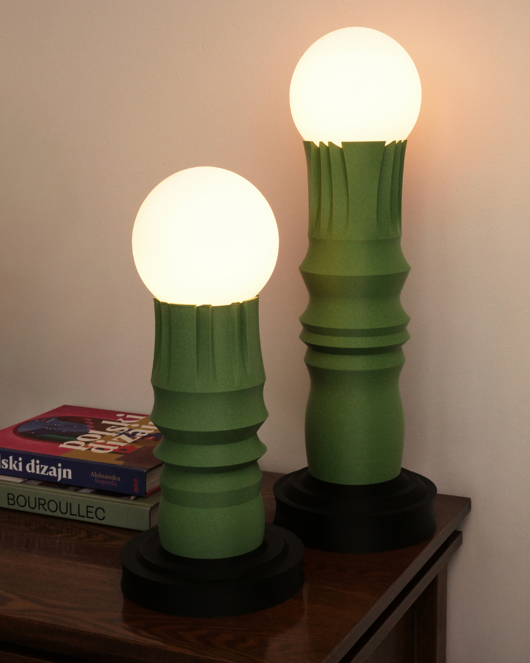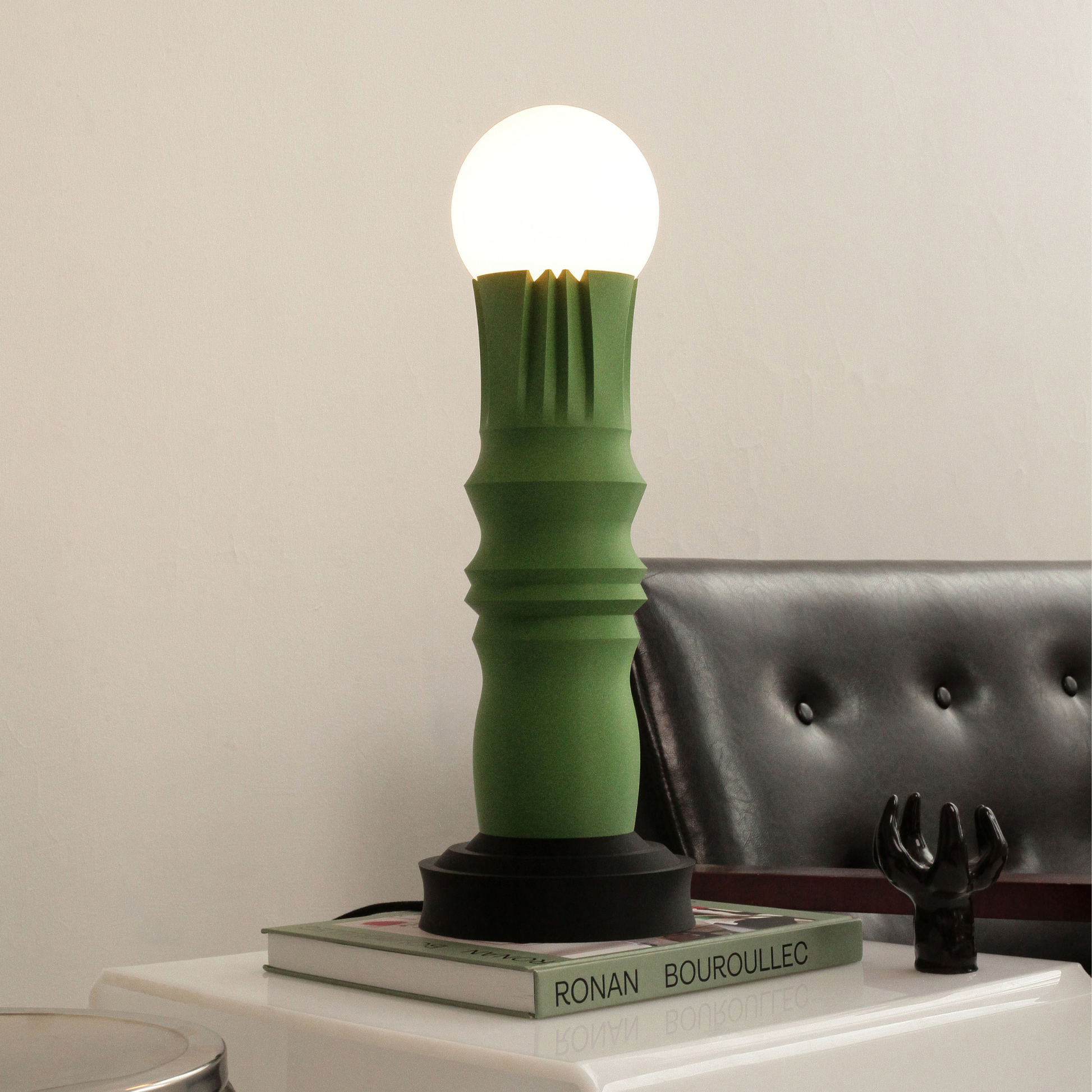 A matte moss-green body paired with a black base creates harmony between nature and structure — subtle yet striking.