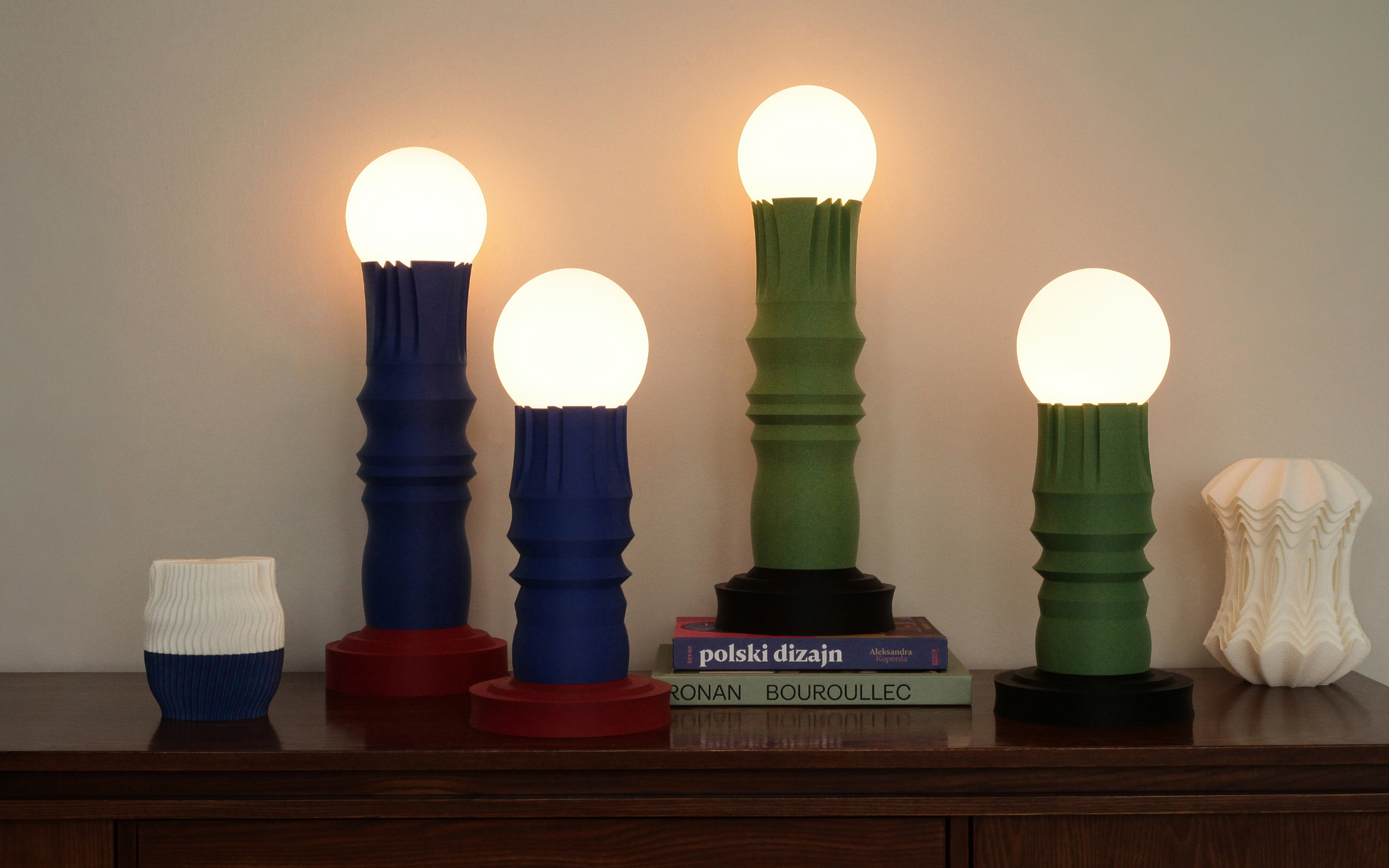 Each piece is 3D-printed in durable, matte PLA, revealing a fine texture and precise rhythm that celebrate the dialogue between design and craft.