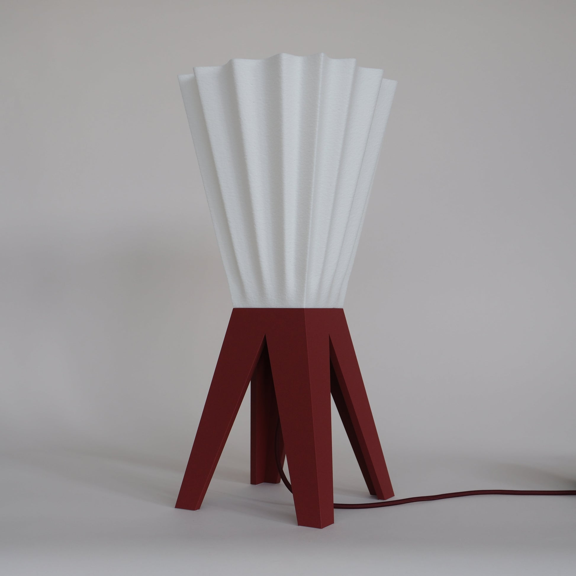 A pleated white shade rises above a deep Burgundy Red base, diffusing light in flowing gradients. The bold angular legs ground the lamp with sculptural strength, balancing softness and structure.